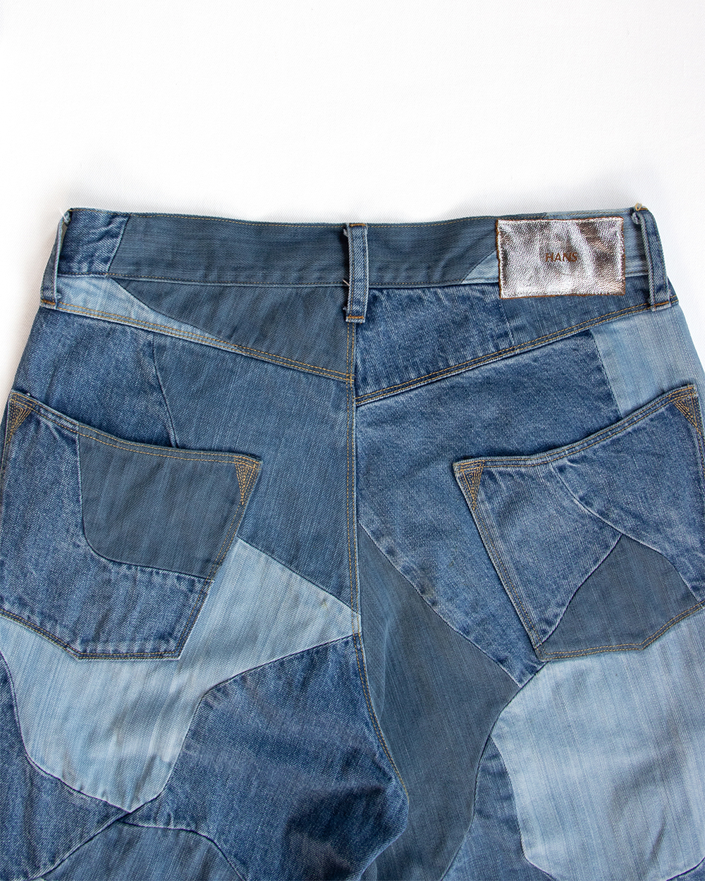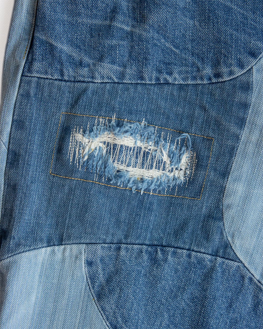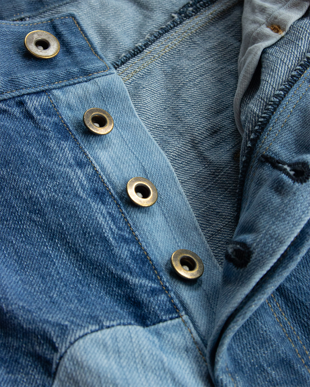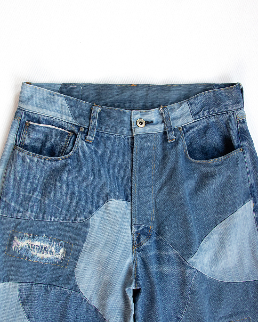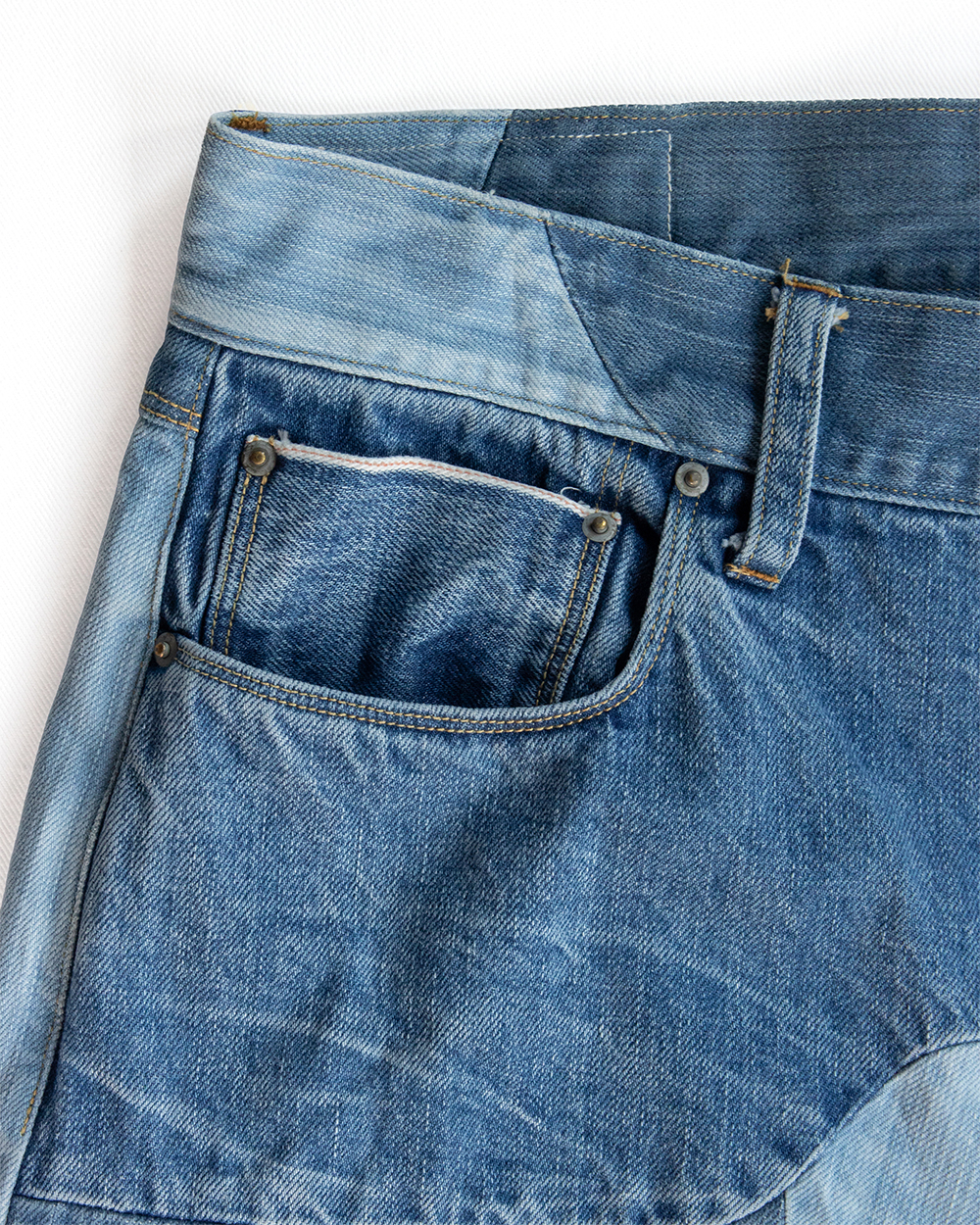 それをデニムに置き換えボロボロに壊れたデニムのきれいな部分だけを抜き取り一つのデニムに再構築したかのように、5種類のセルビッチデニムをパッチワークして一本のデニムに仕立てました。