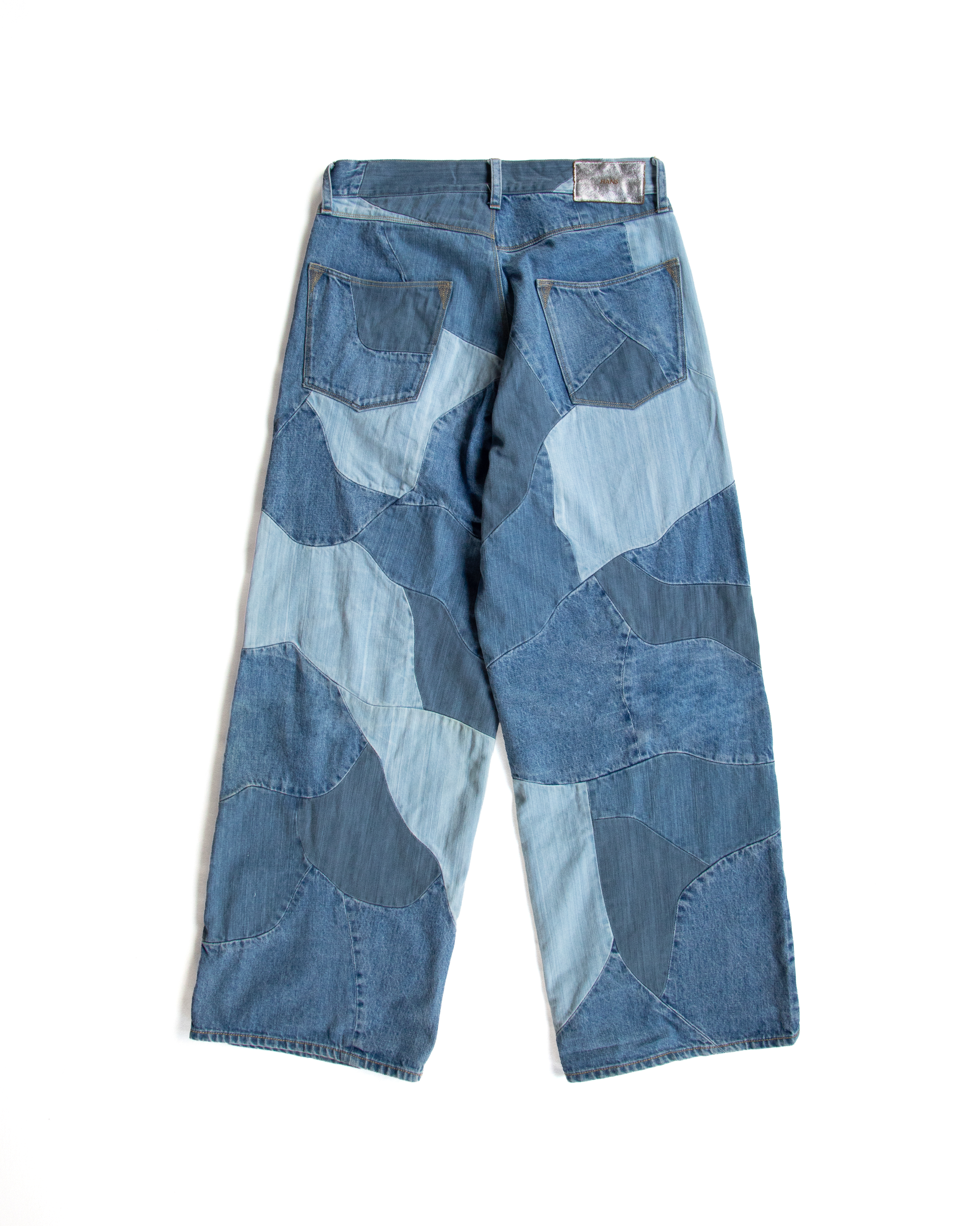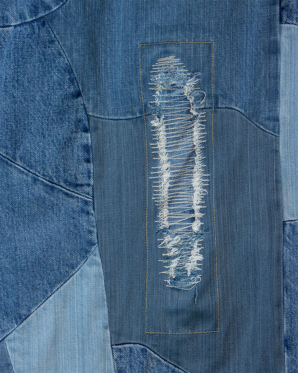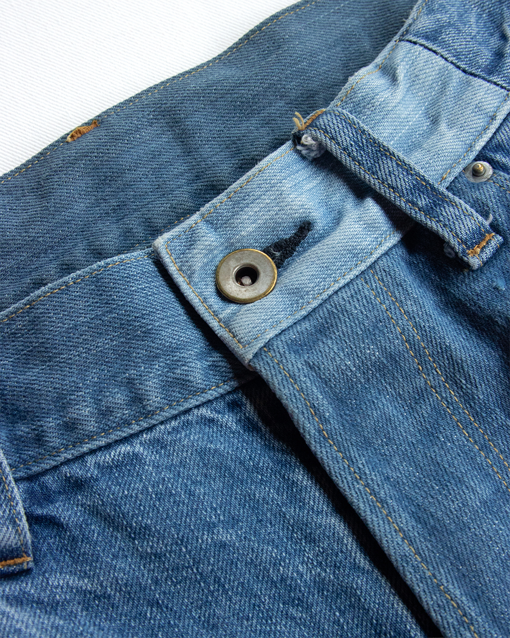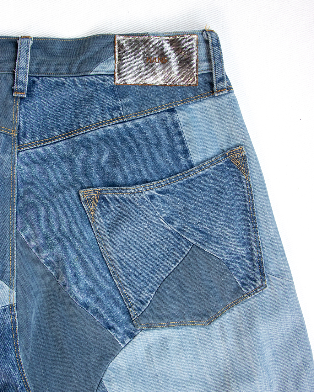 それをデニムに置き換えボロボロに壊れたデニムのきれいな部分だけを抜き取り一つのデニムに再構築したかのように、5種類のセルビッチデニムをパッチワークして一本のデニムに仕立てました。