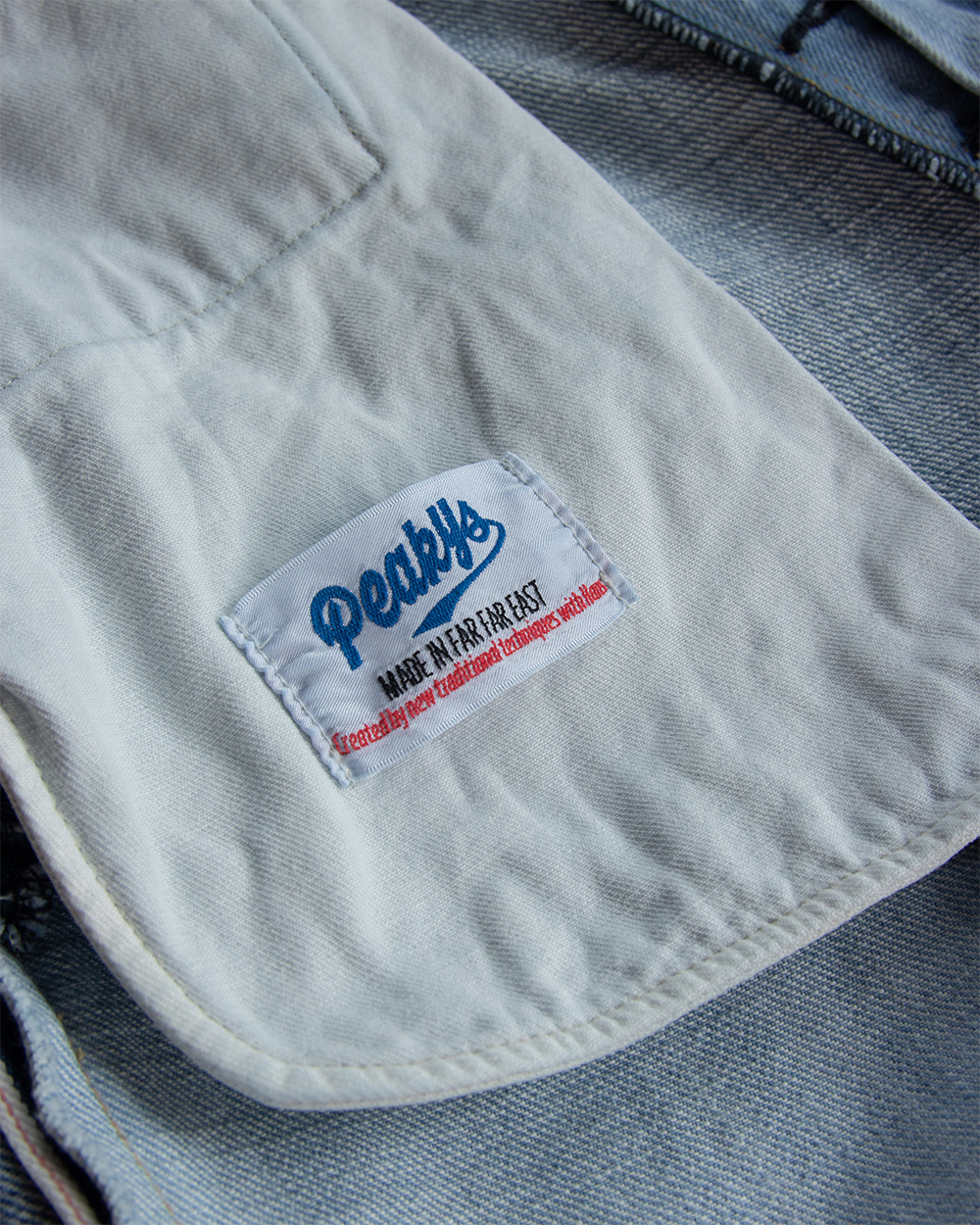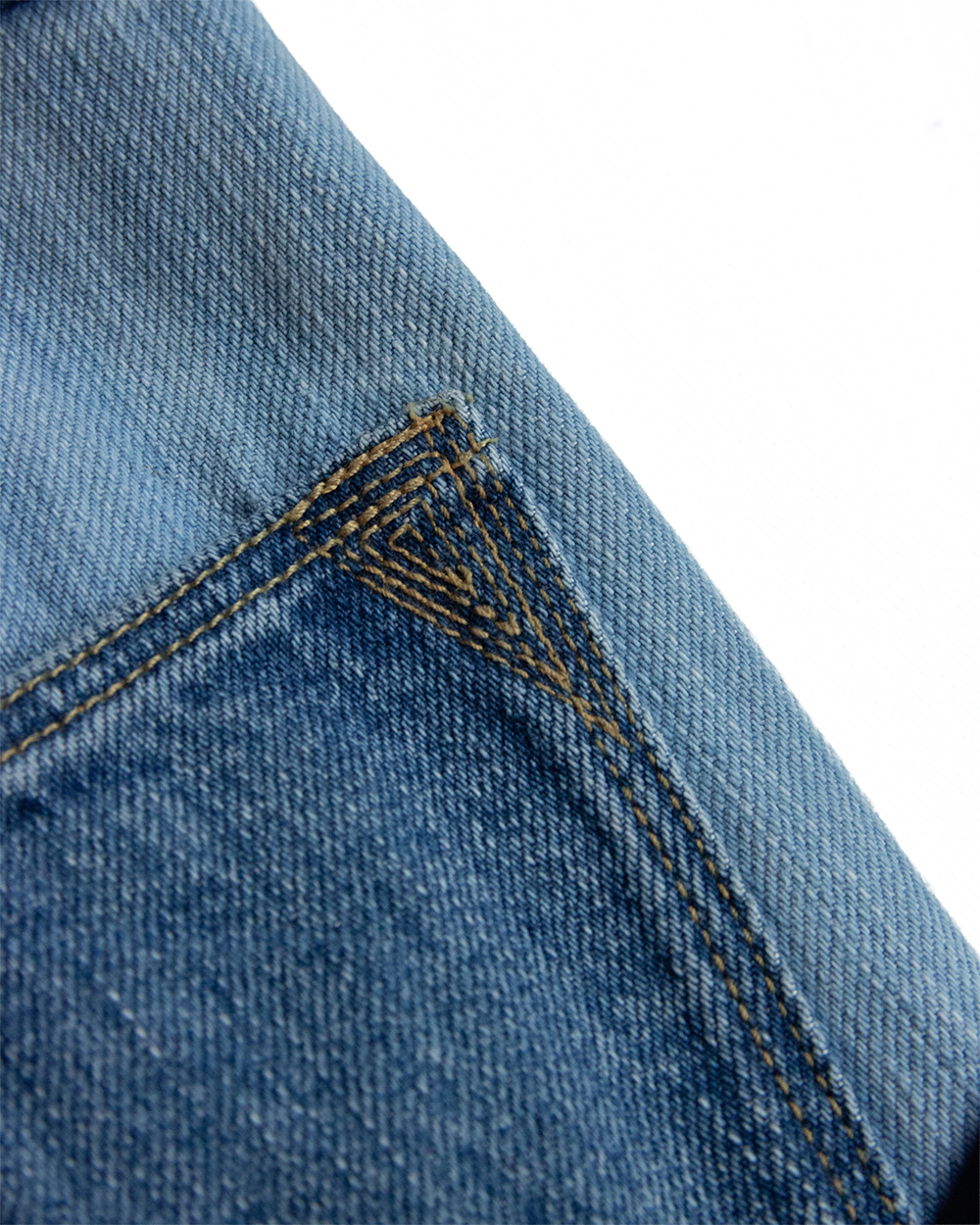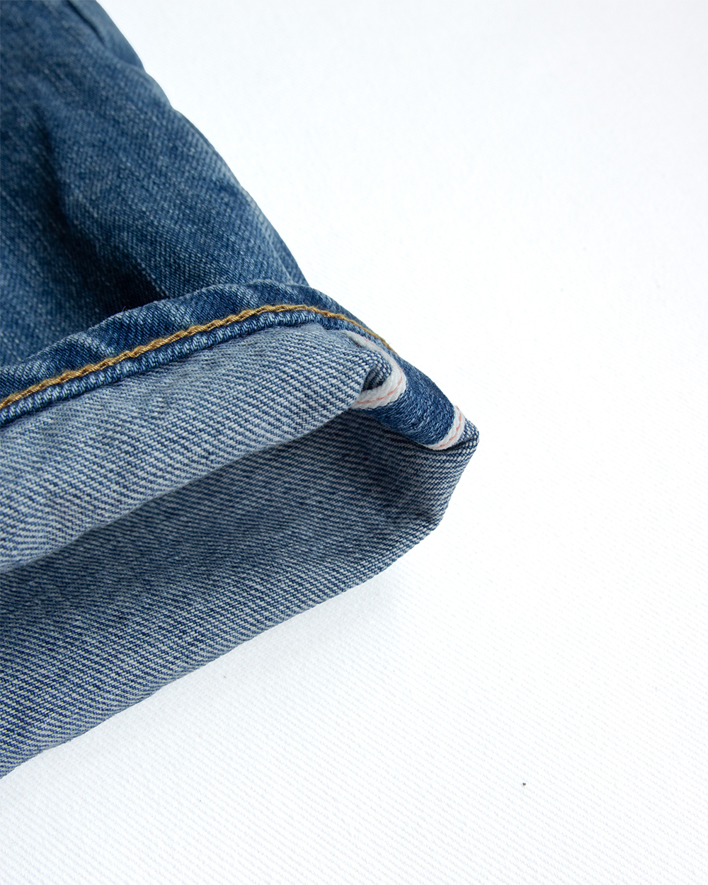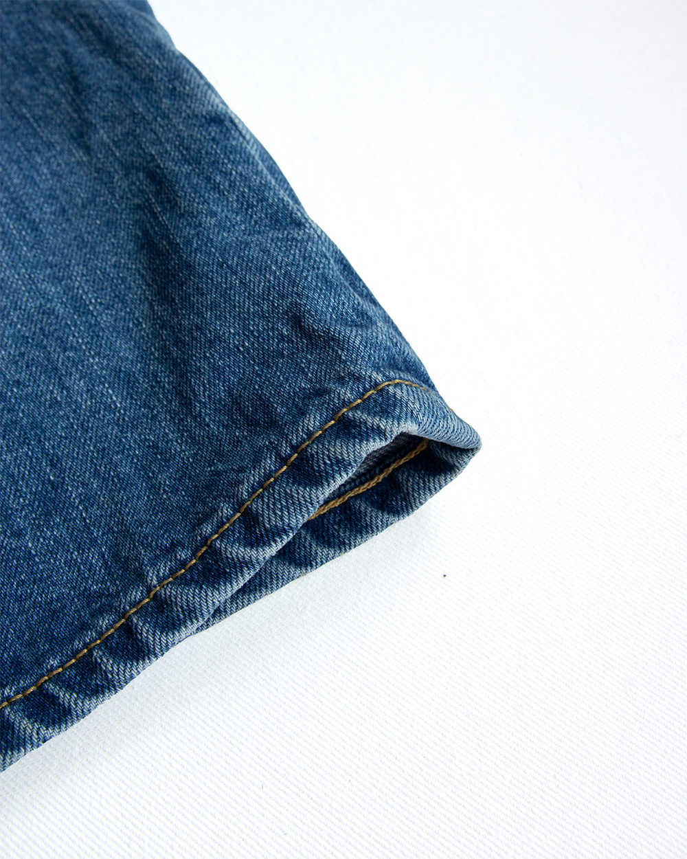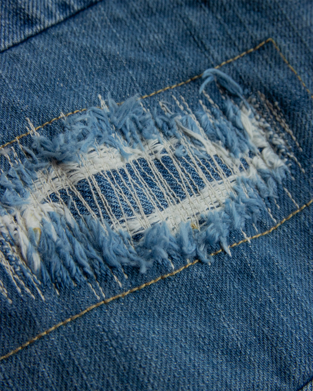 それをデニムに置き換えボロボロに壊れたデニムのきれいな部分だけを抜き取り一つのデニムに再構築したかのように、5種類のセルビッチデニムをパッチワークして一本のデニムに仕立てました。
