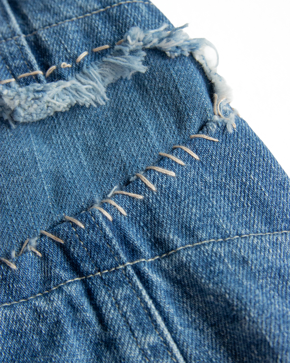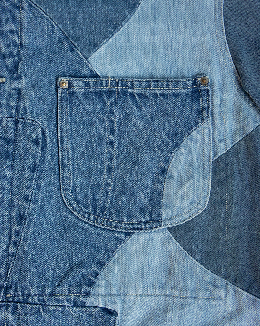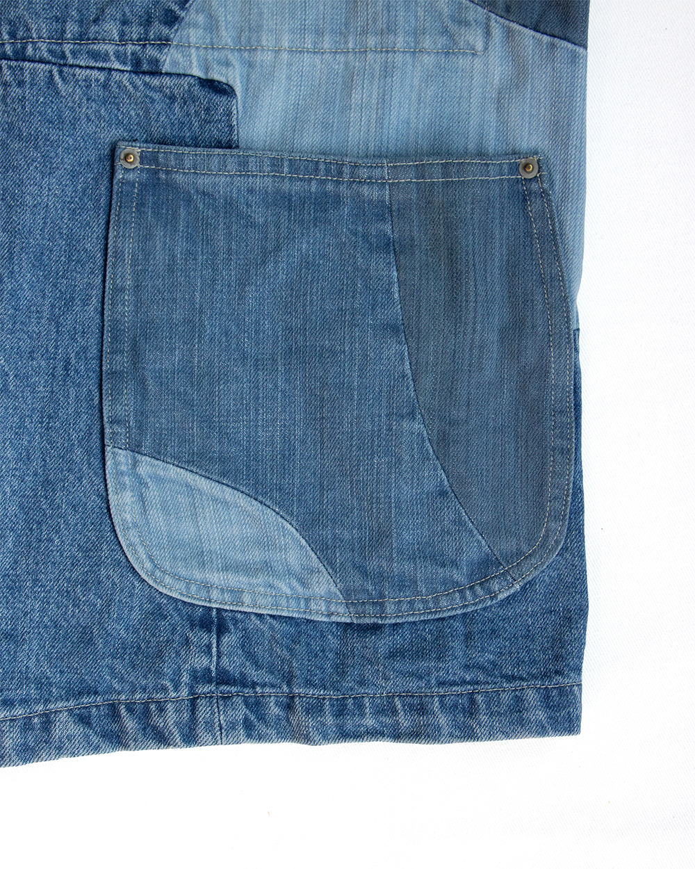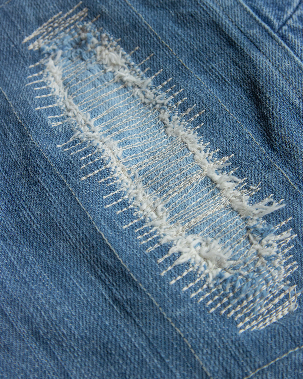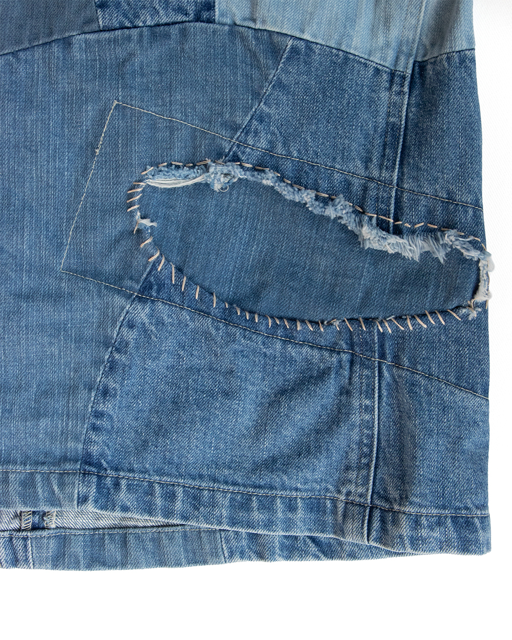 それをデニムに置き換えボロボロに壊れたデニムのきれいな部分だけを抜き取り一つのデニムに再構築したかのように、5種類のセルビッチデニムをパッチワークして一本のデニムに仕立てました。