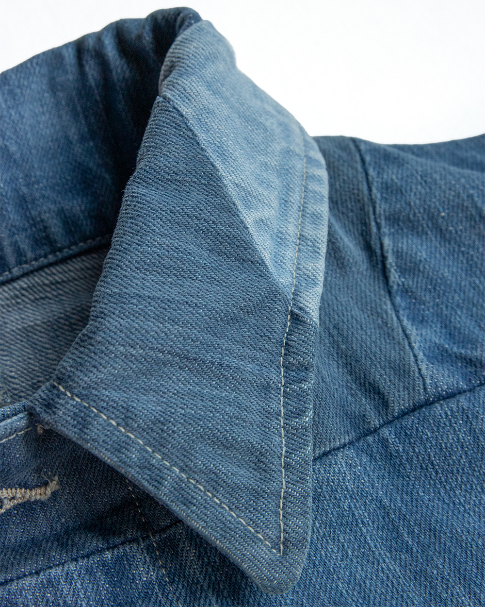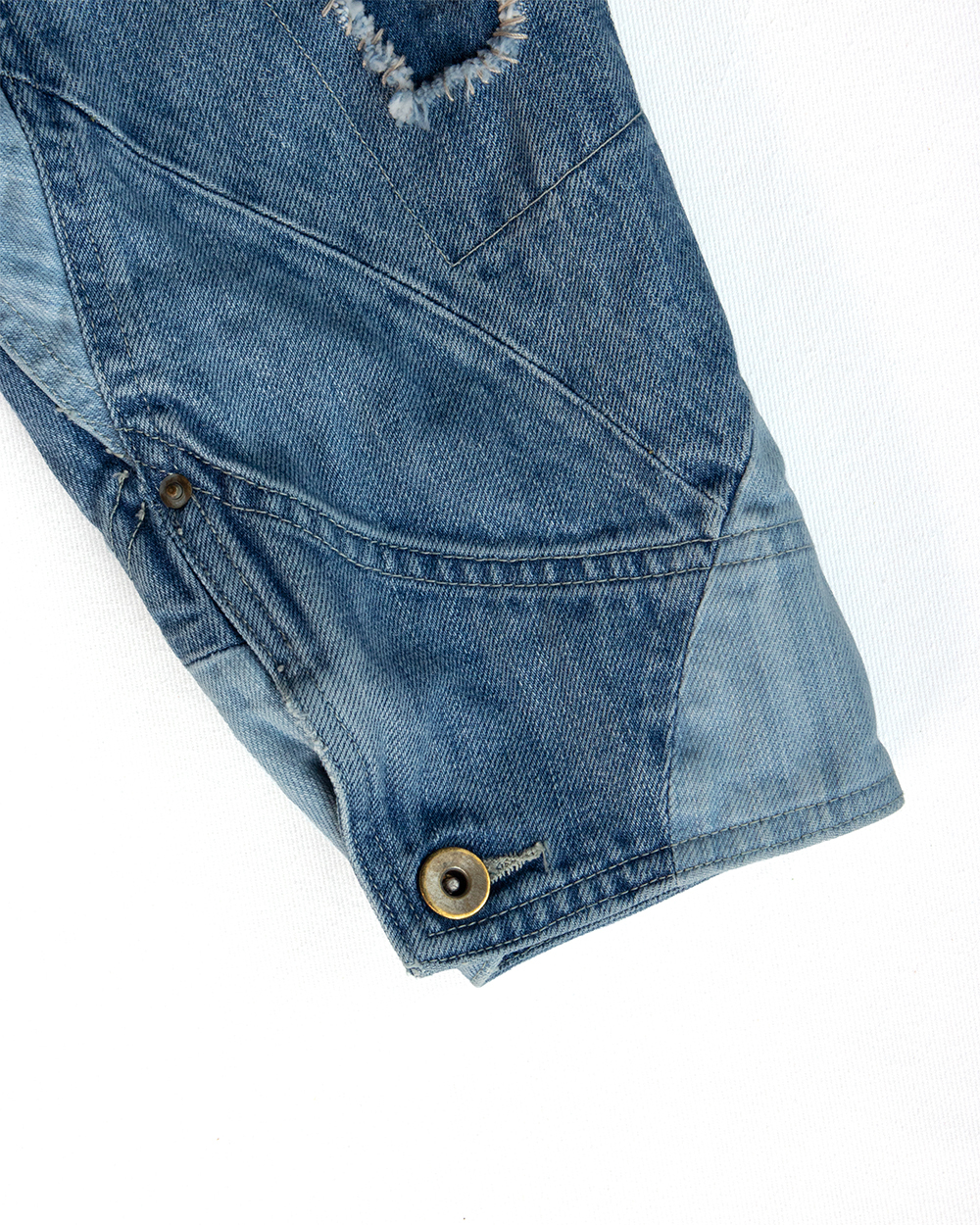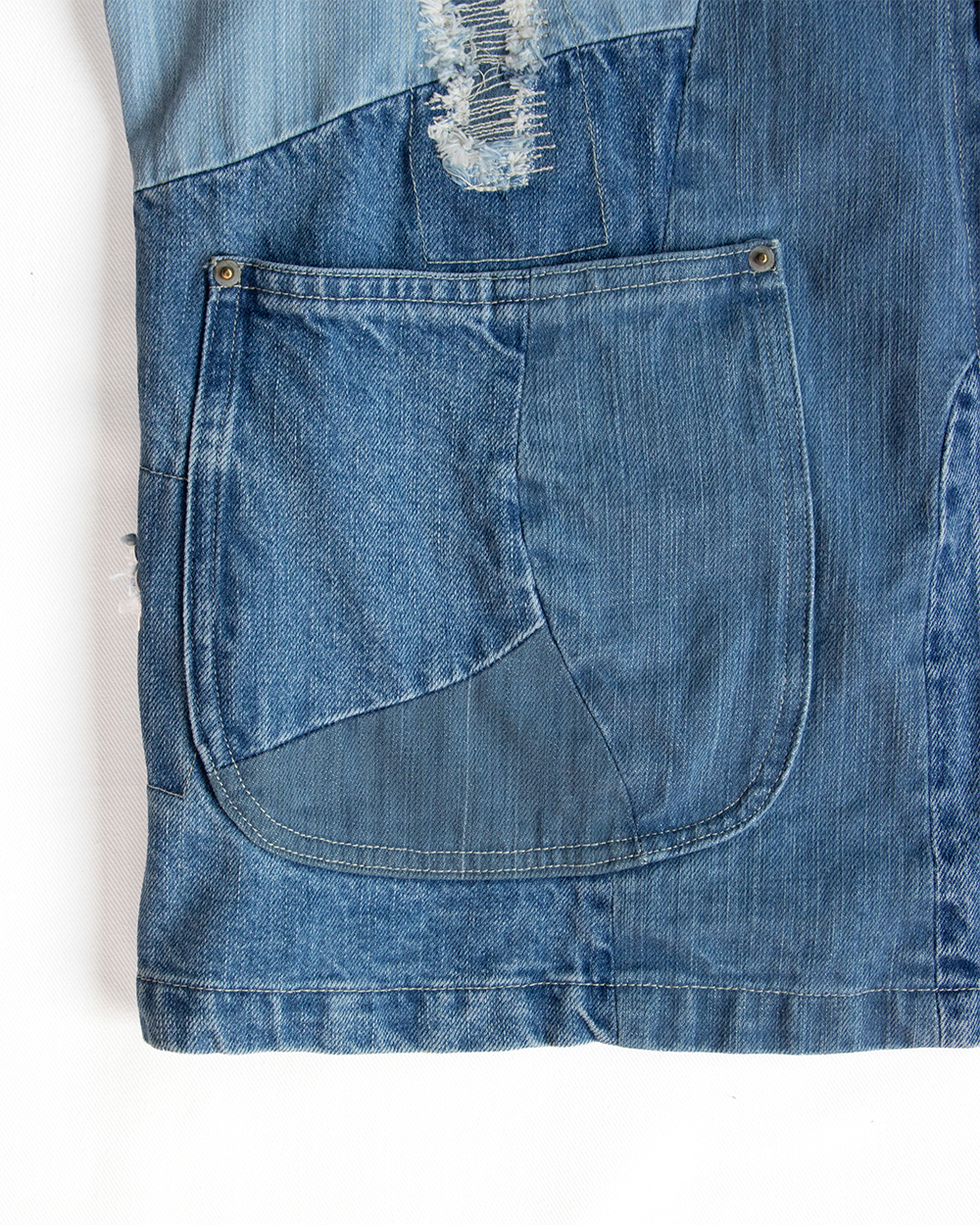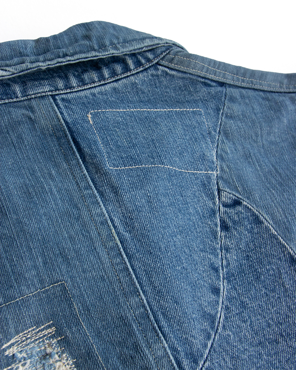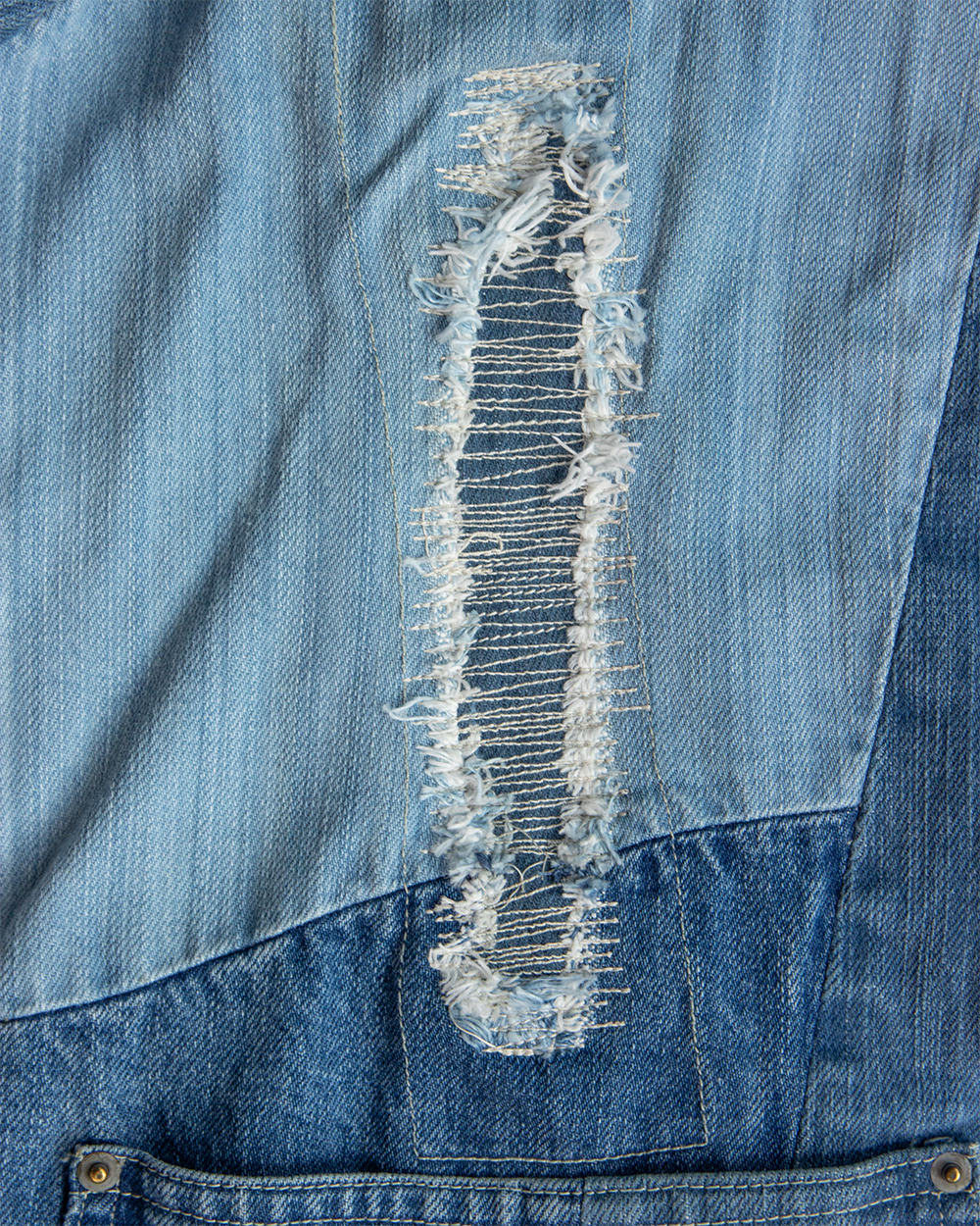 それをデニムに置き換えボロボロに壊れたデニムのきれいな部分だけを抜き取り一つのデニムに再構築したかのように、5種類のセルビッチデニムをパッチワークして一本のデニムに仕立てました。