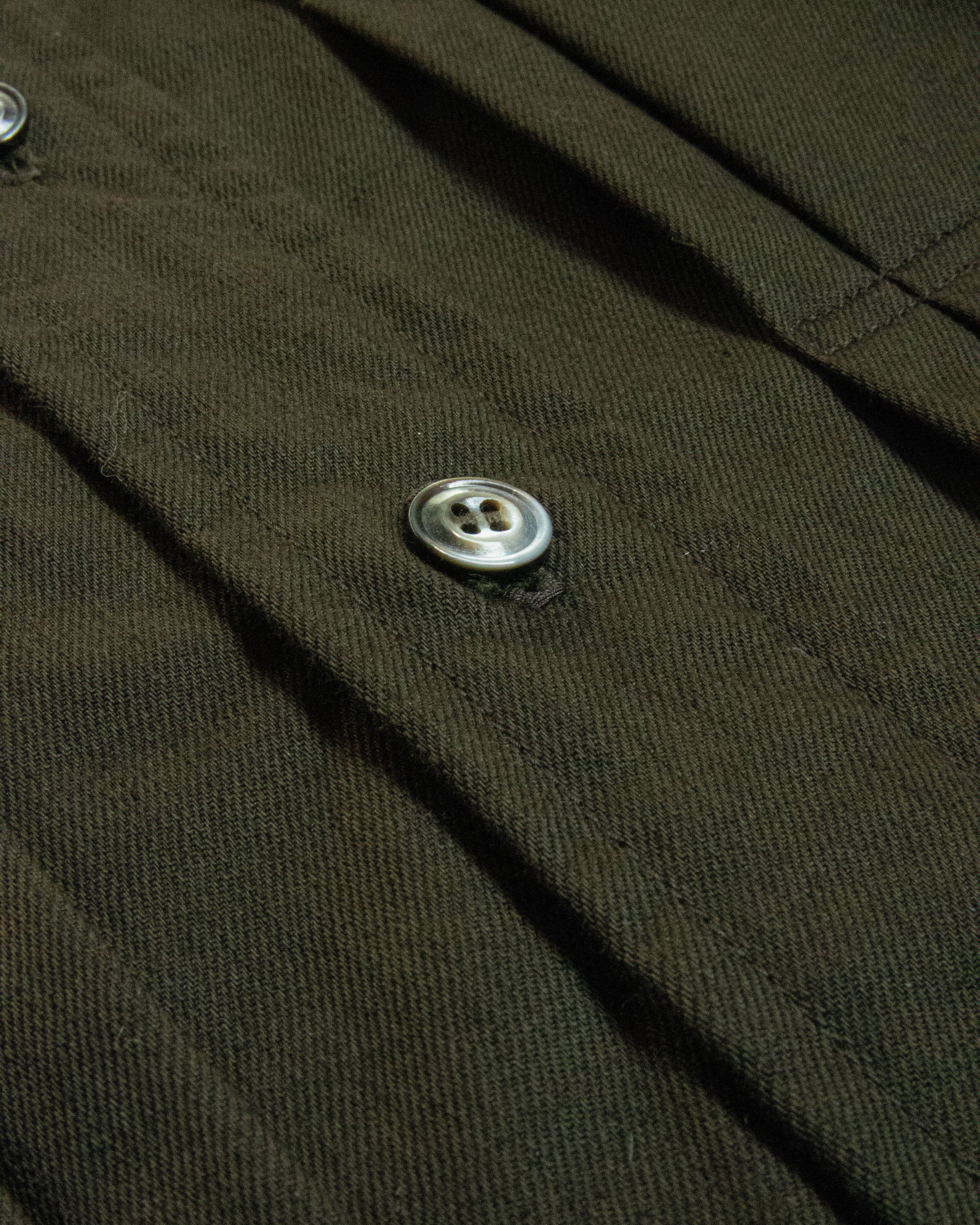 前立てはデザイン性もありながらパンツに入れた際に前立てがごろつかない様20年代のシャツをお手本に仕立てました、リラックス感を損なわないよう芯材は接着タイプやケミカルなものは使わず薄いスレキを使用しています。