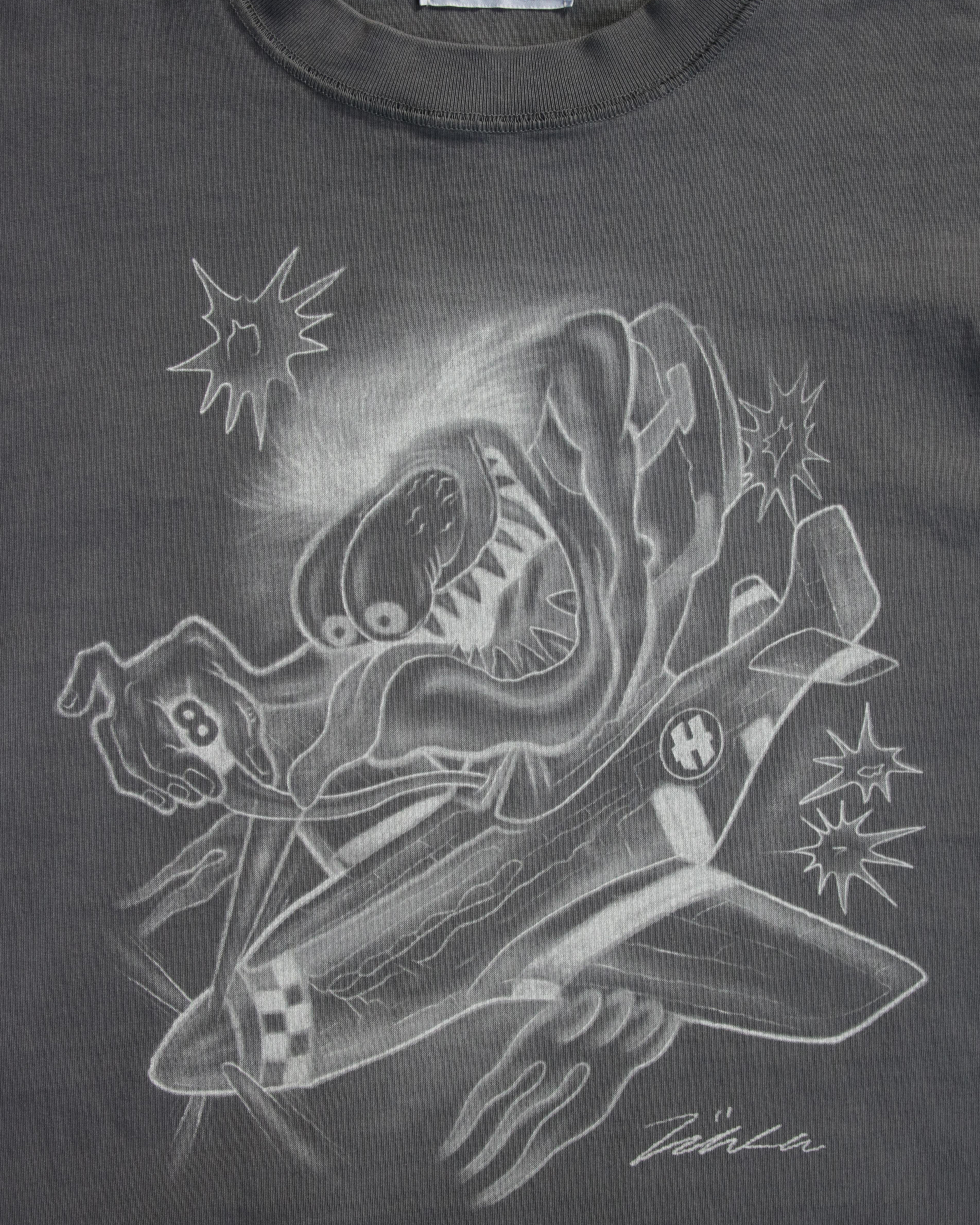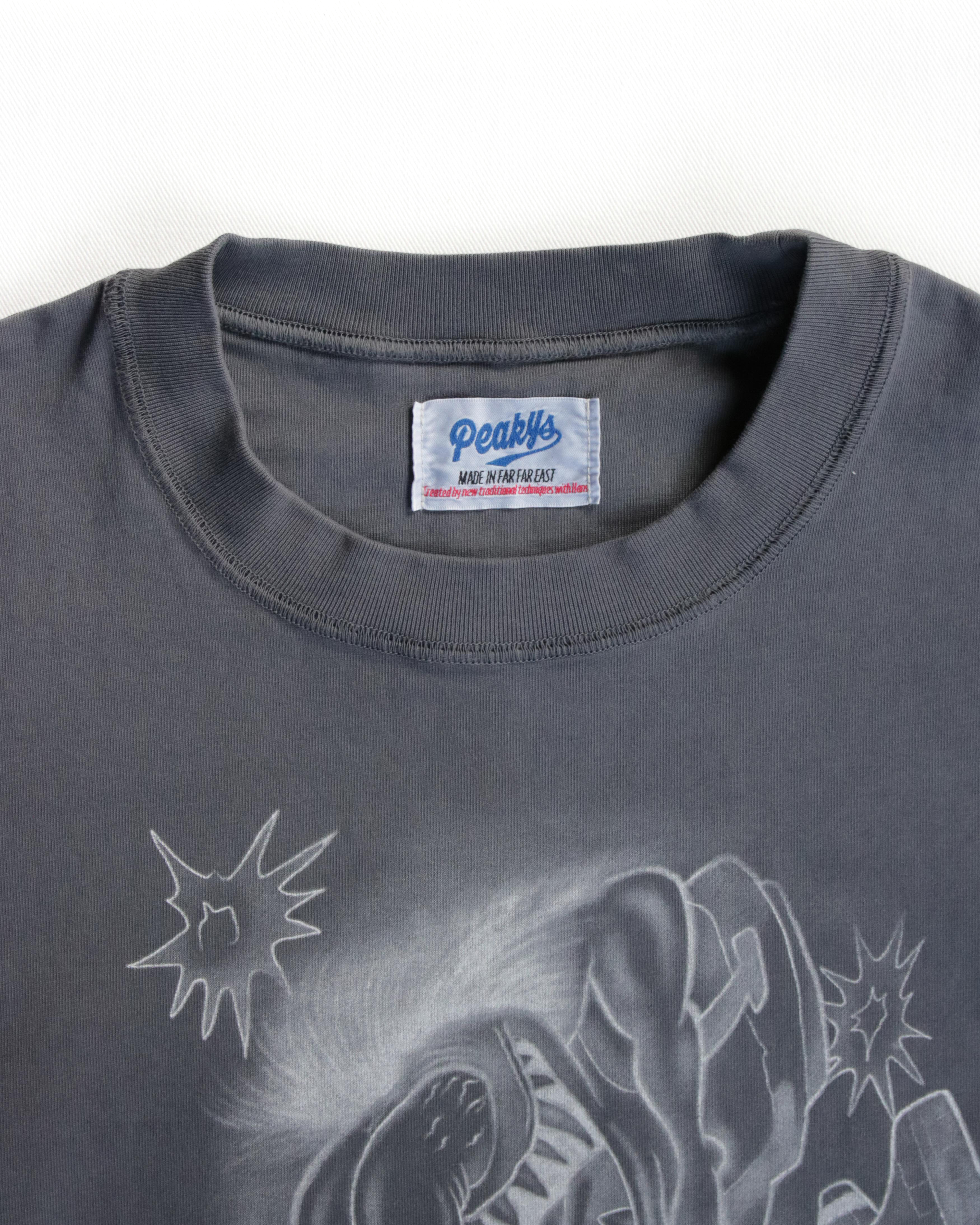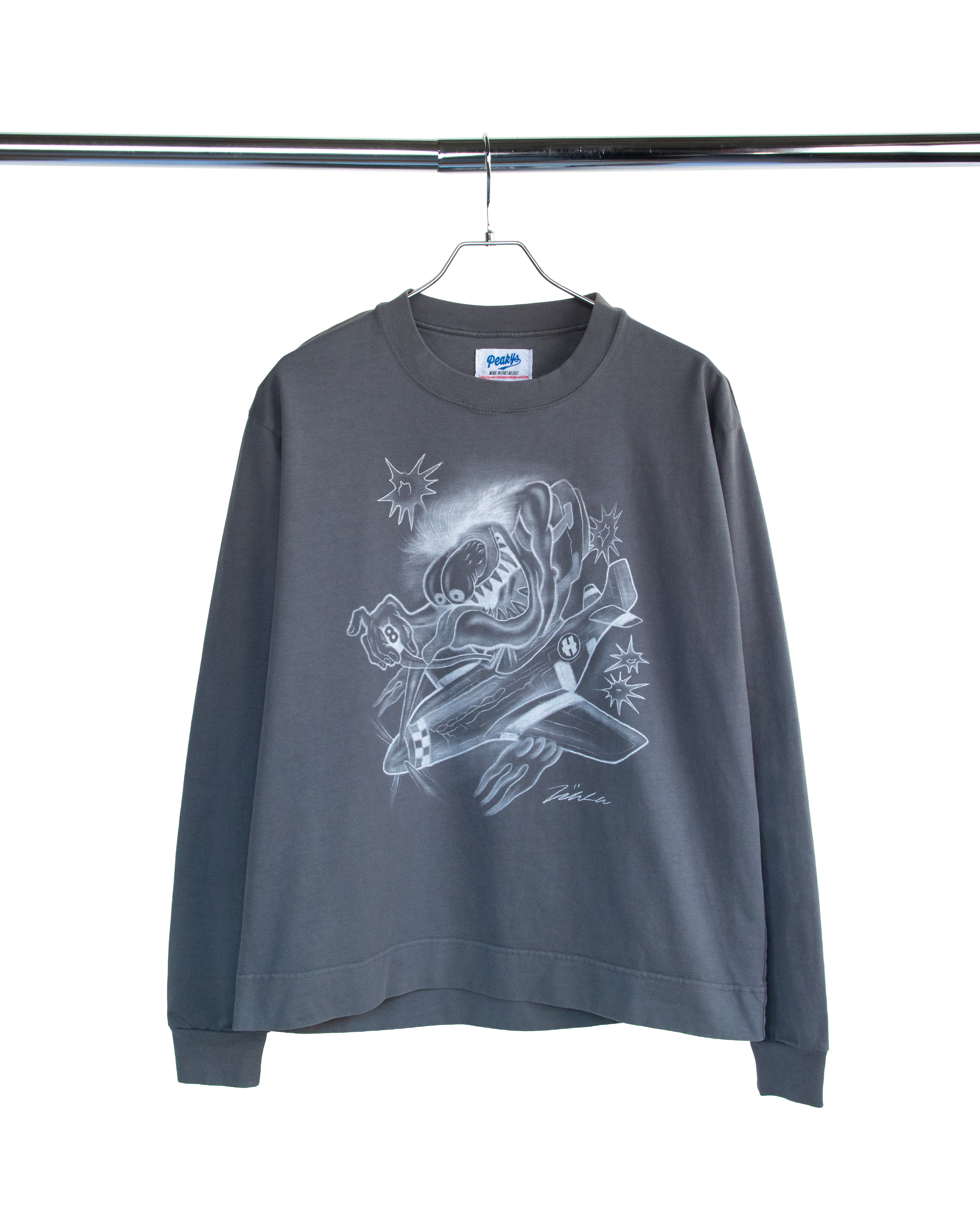 原画のスプレープリントの手描き感やぼかしの美しさを精密に表現するために、シルクスクリーンの手捺染でプリントしています。