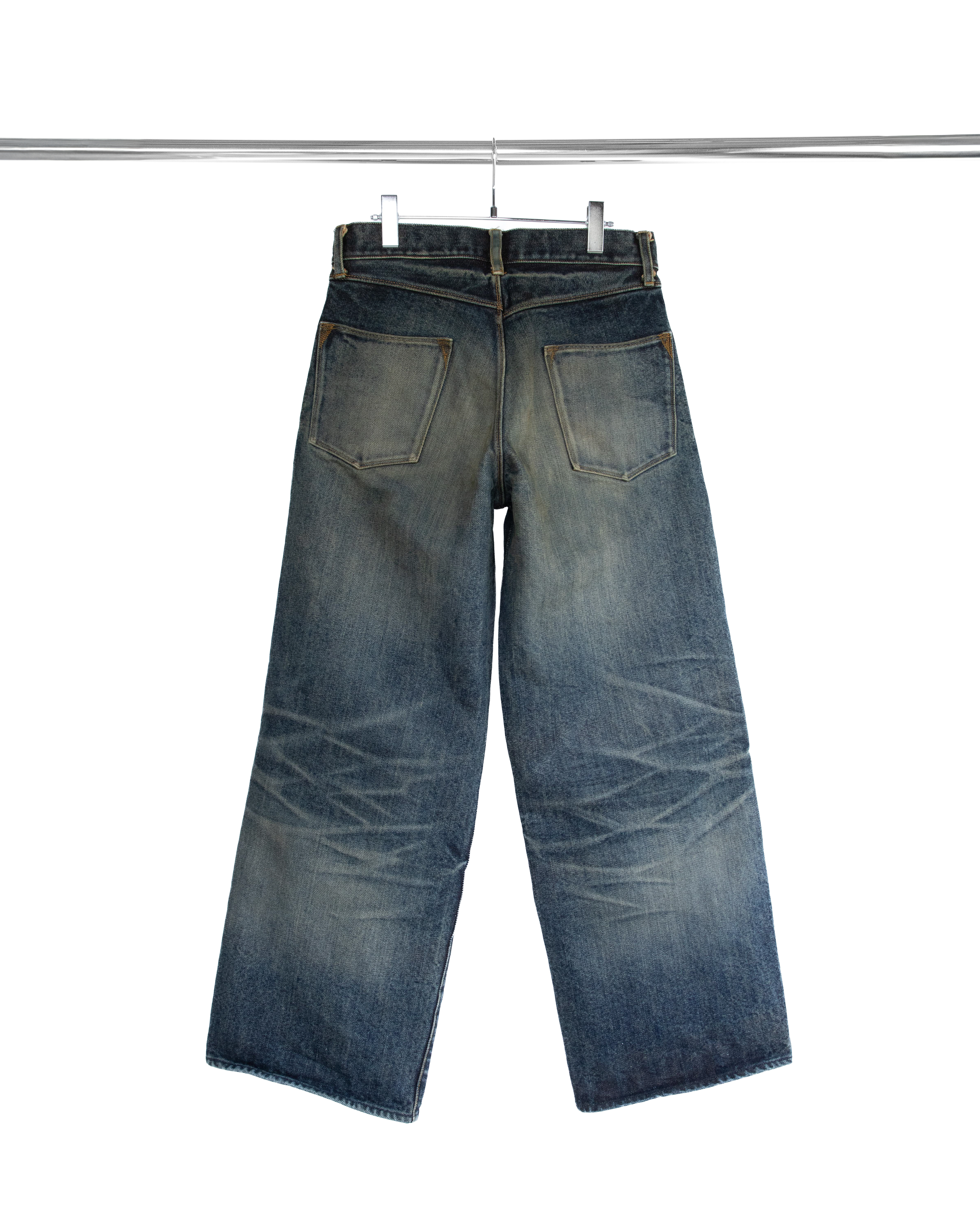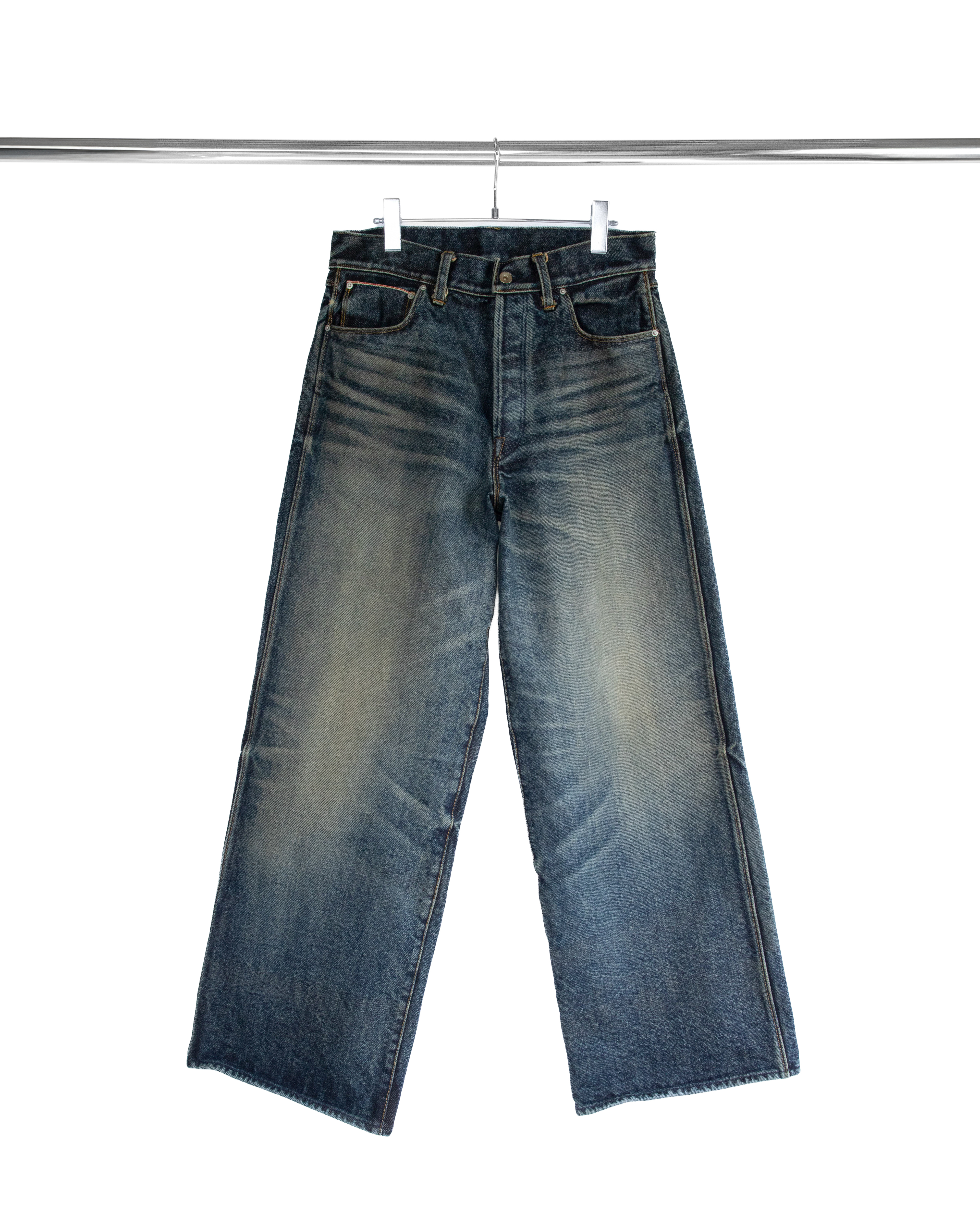 腰回りにフィット感を持たせた、ワイドストレートの5ポケットです。ストンときれいな落ち感の出るよう設計しているので実際の幅よりも細く長く見える事が特徴です。