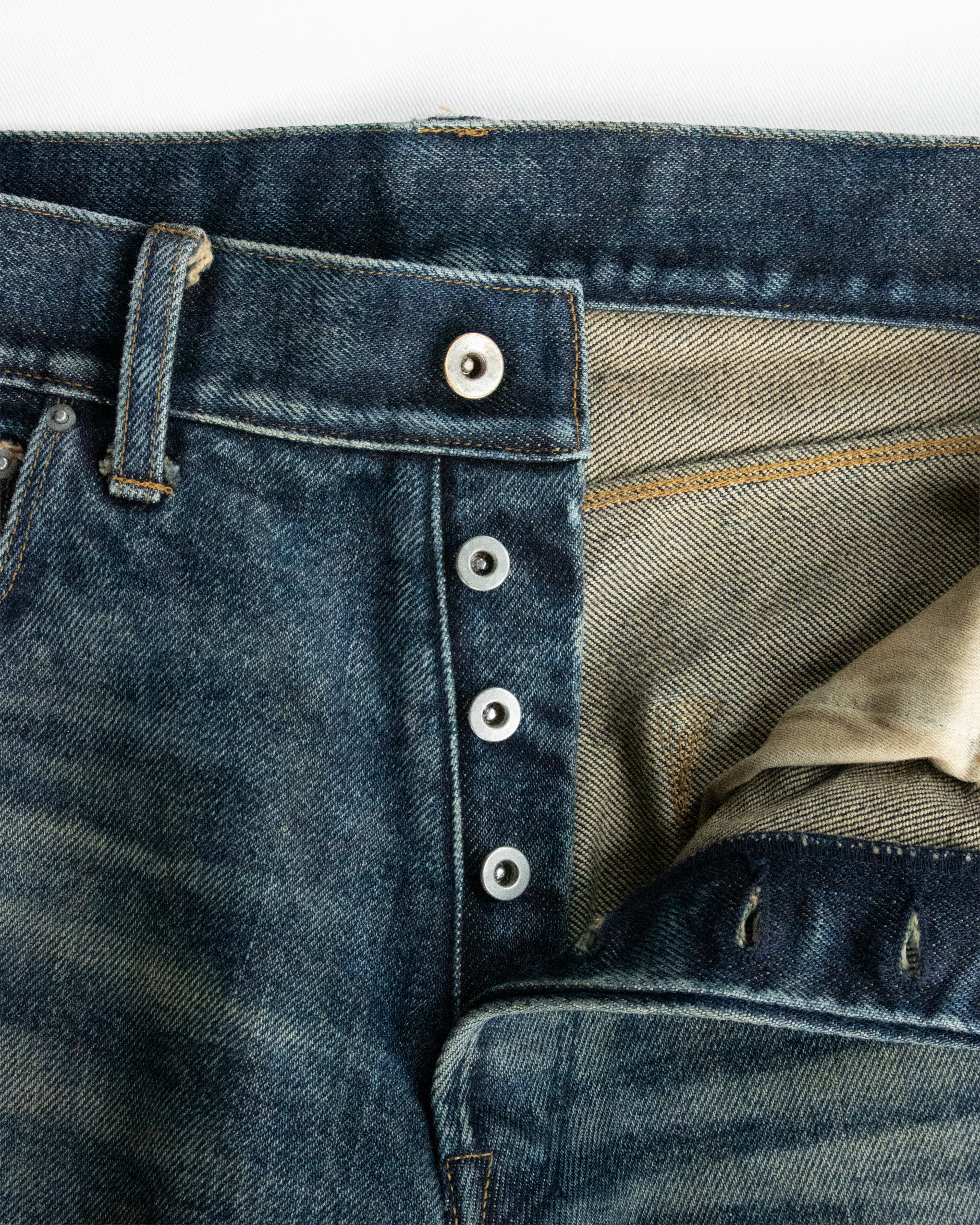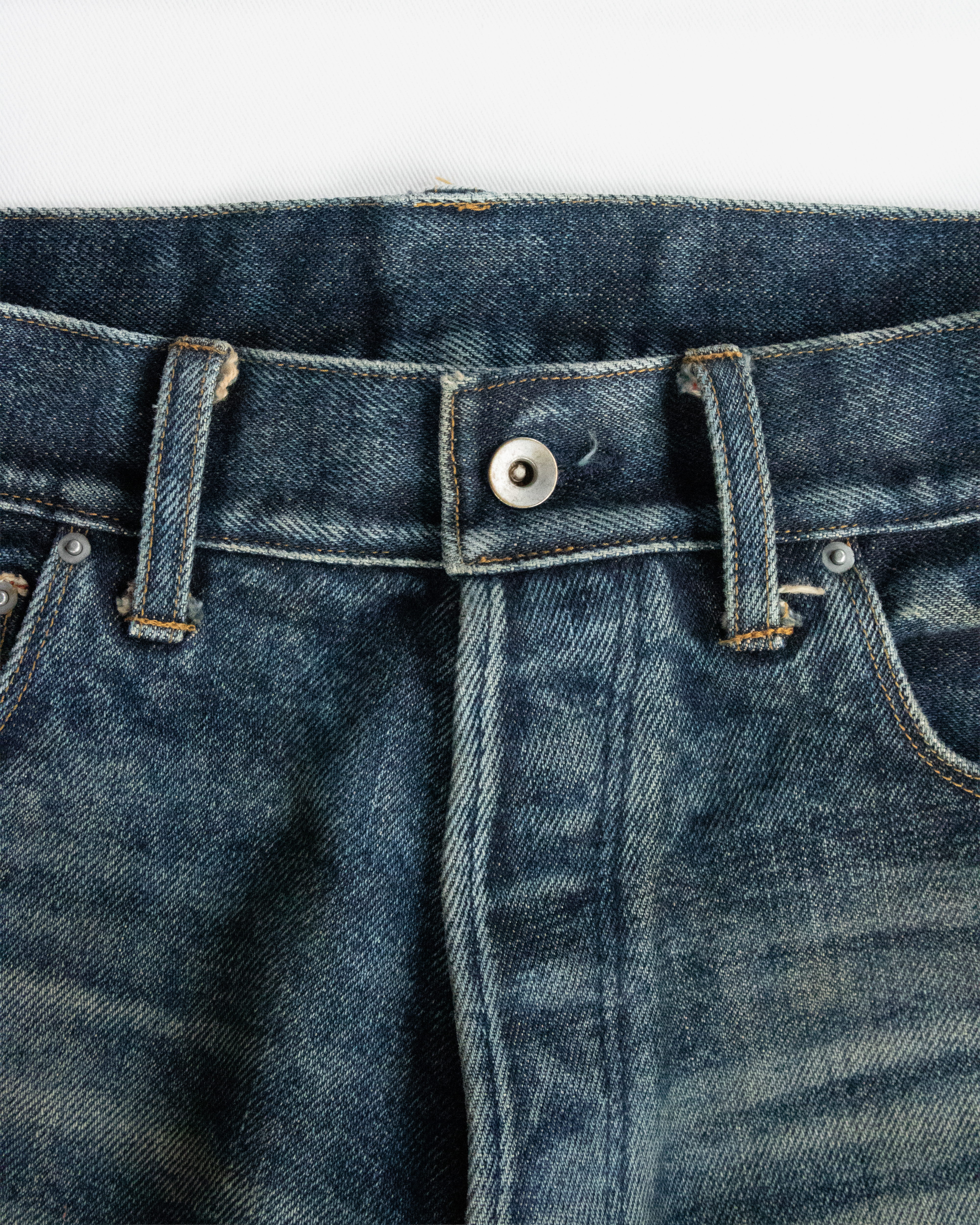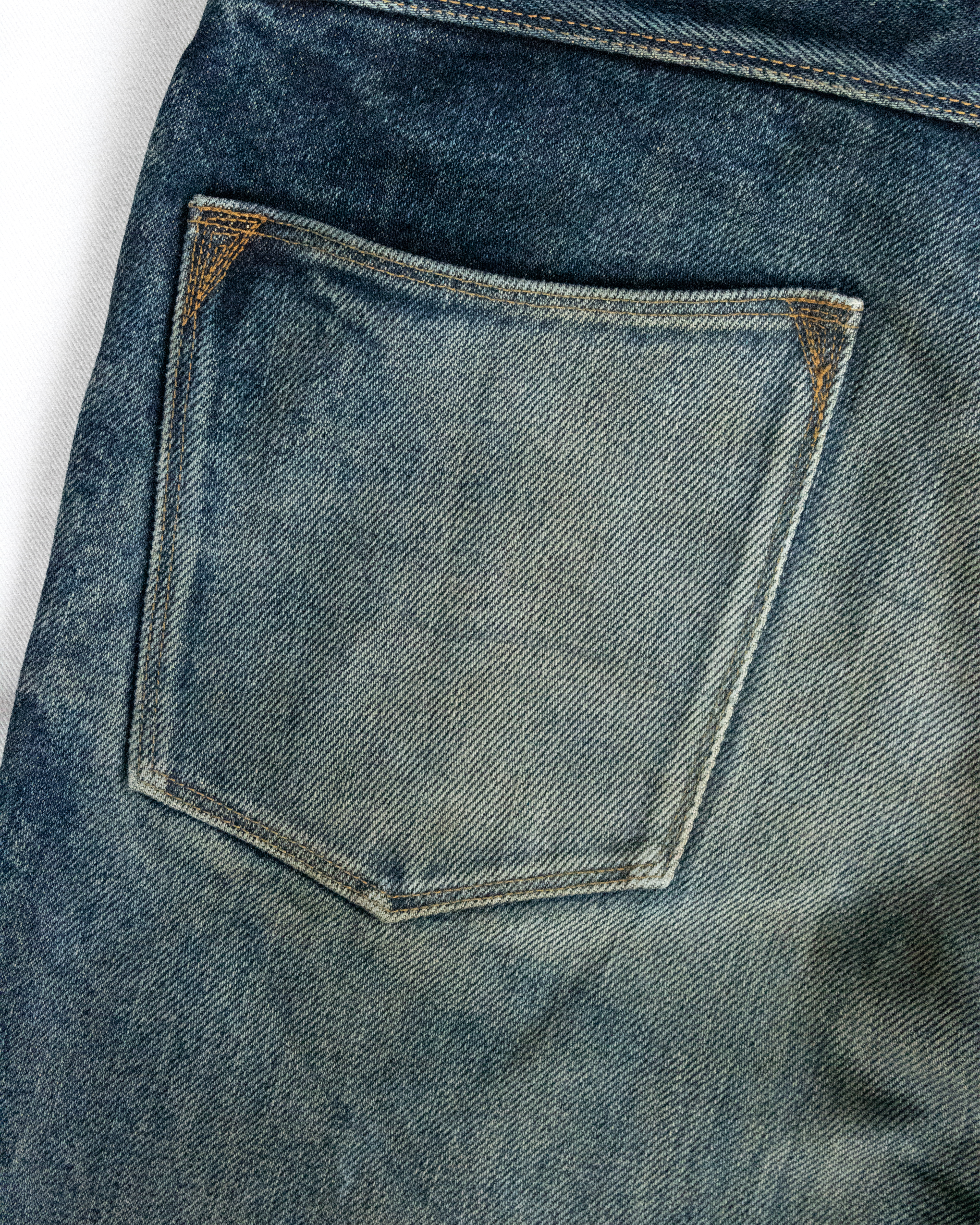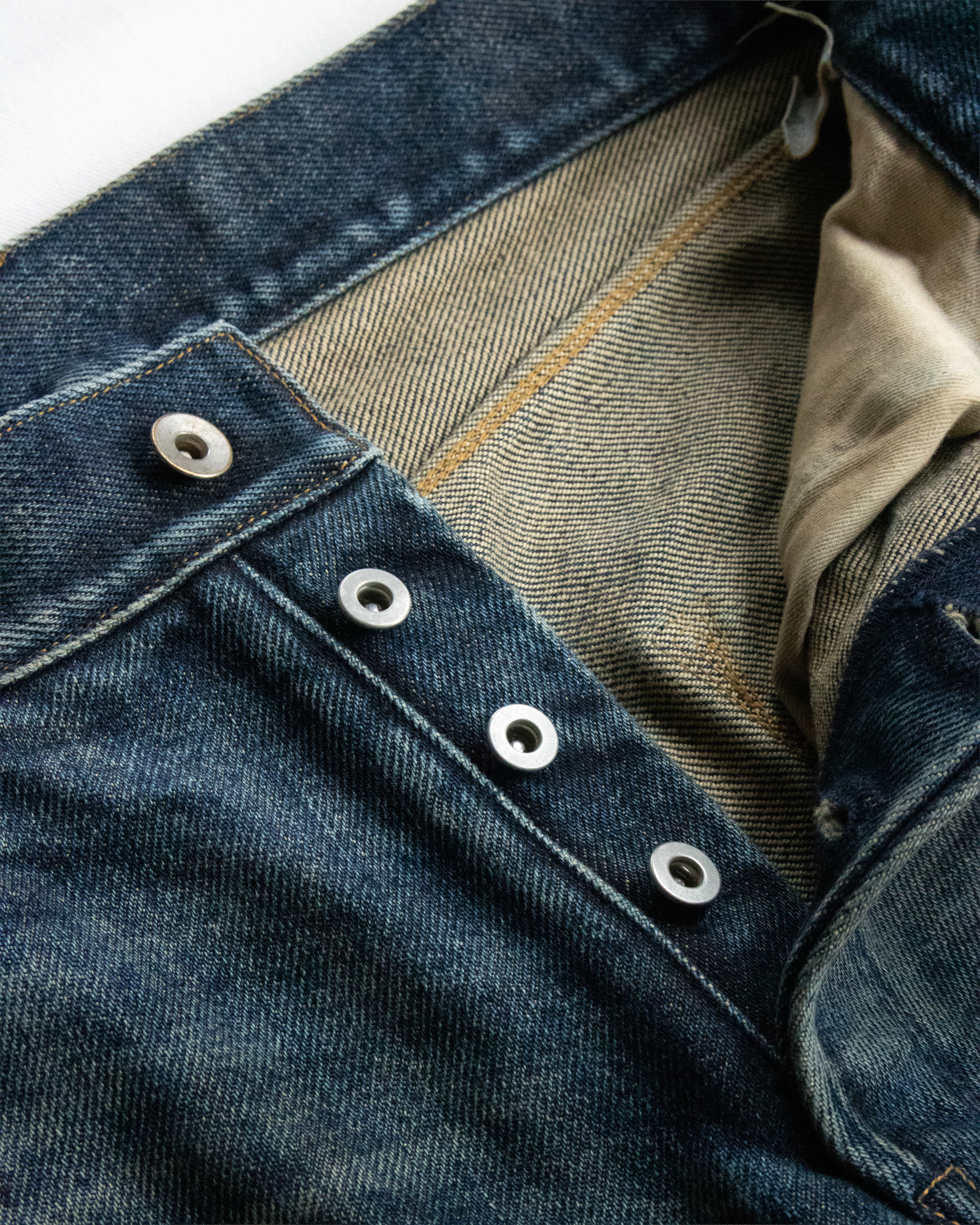 後ろ中心のみ墨藍染のベルトループにしているので本藍とindigoの経年変化の差を楽しんでください。