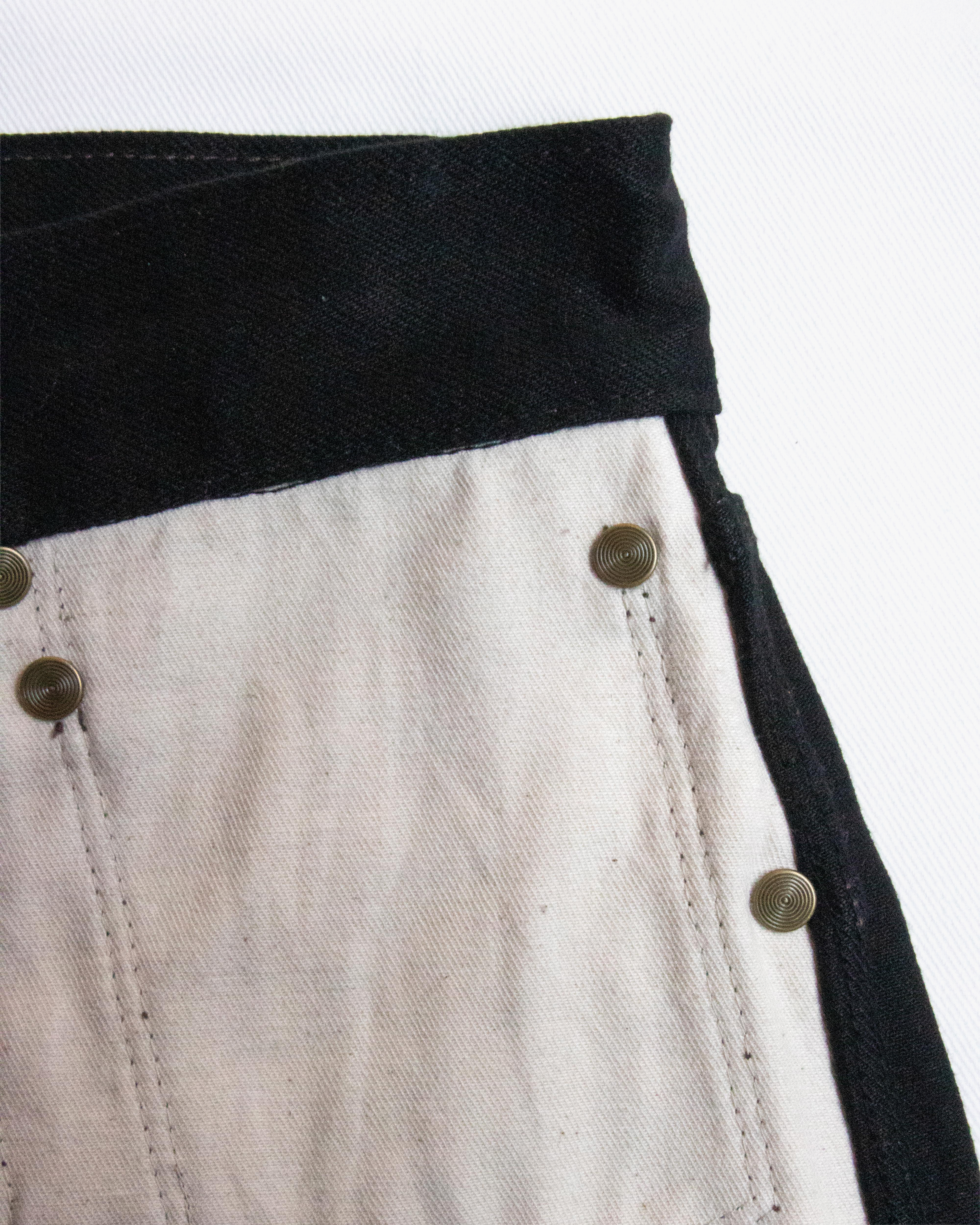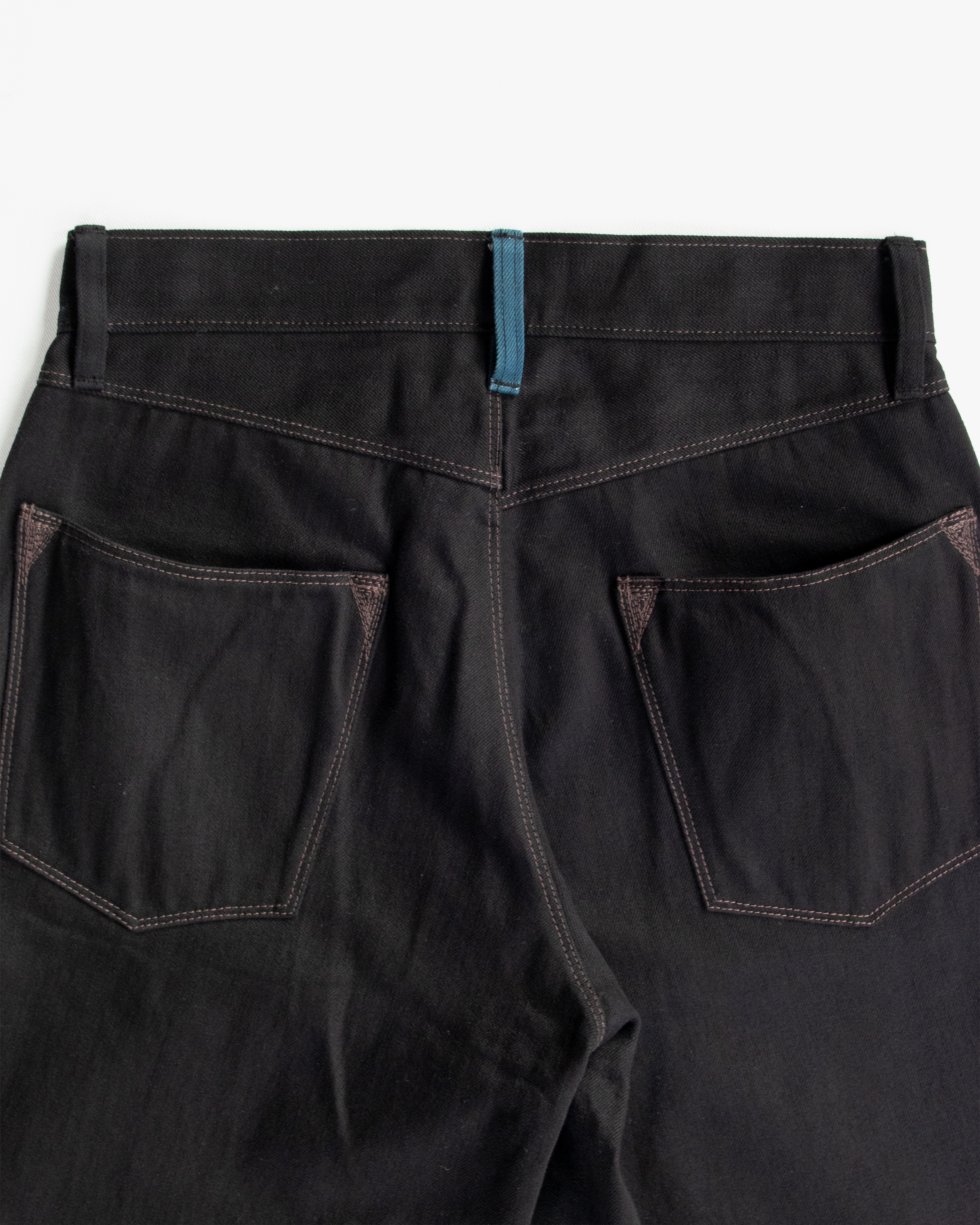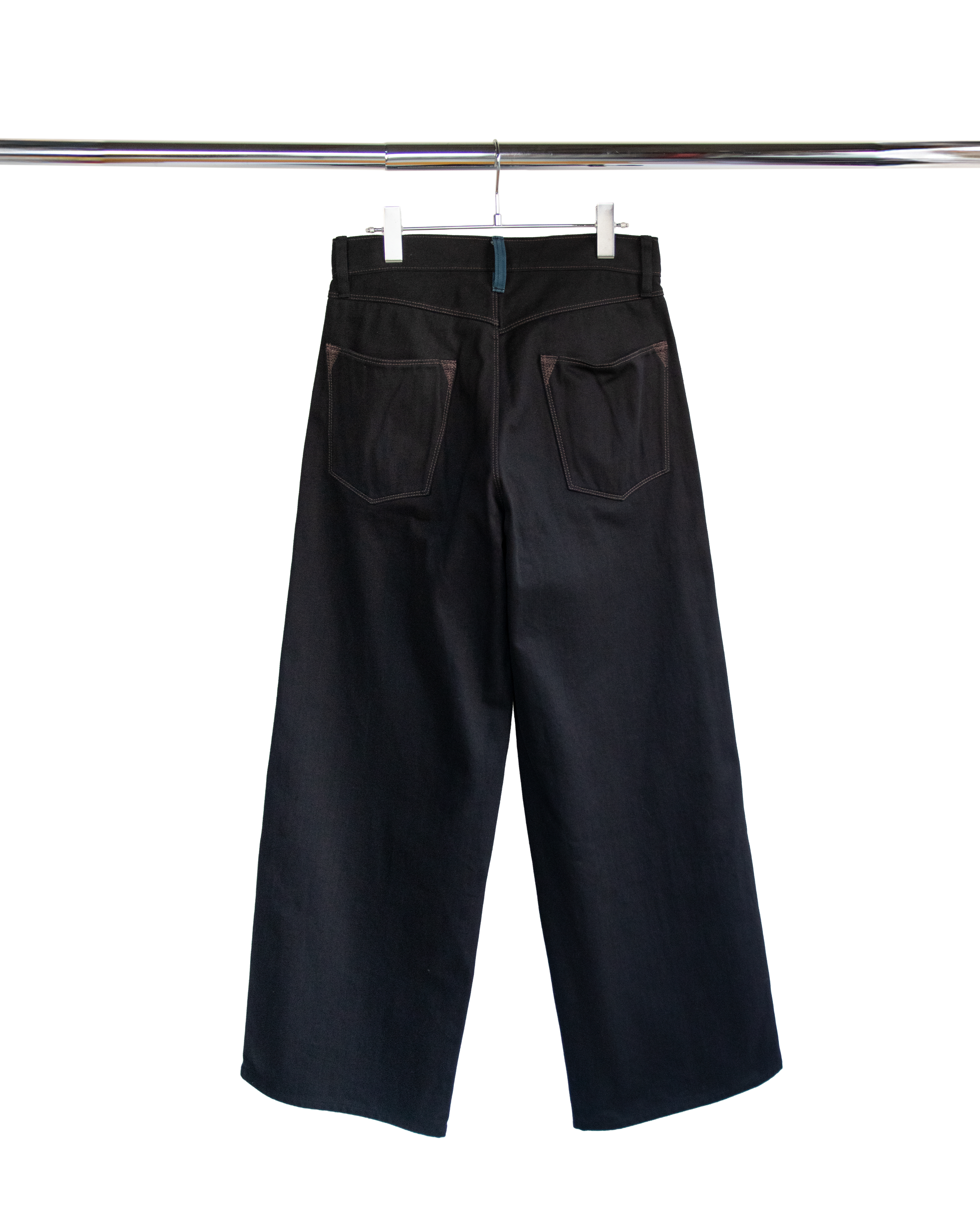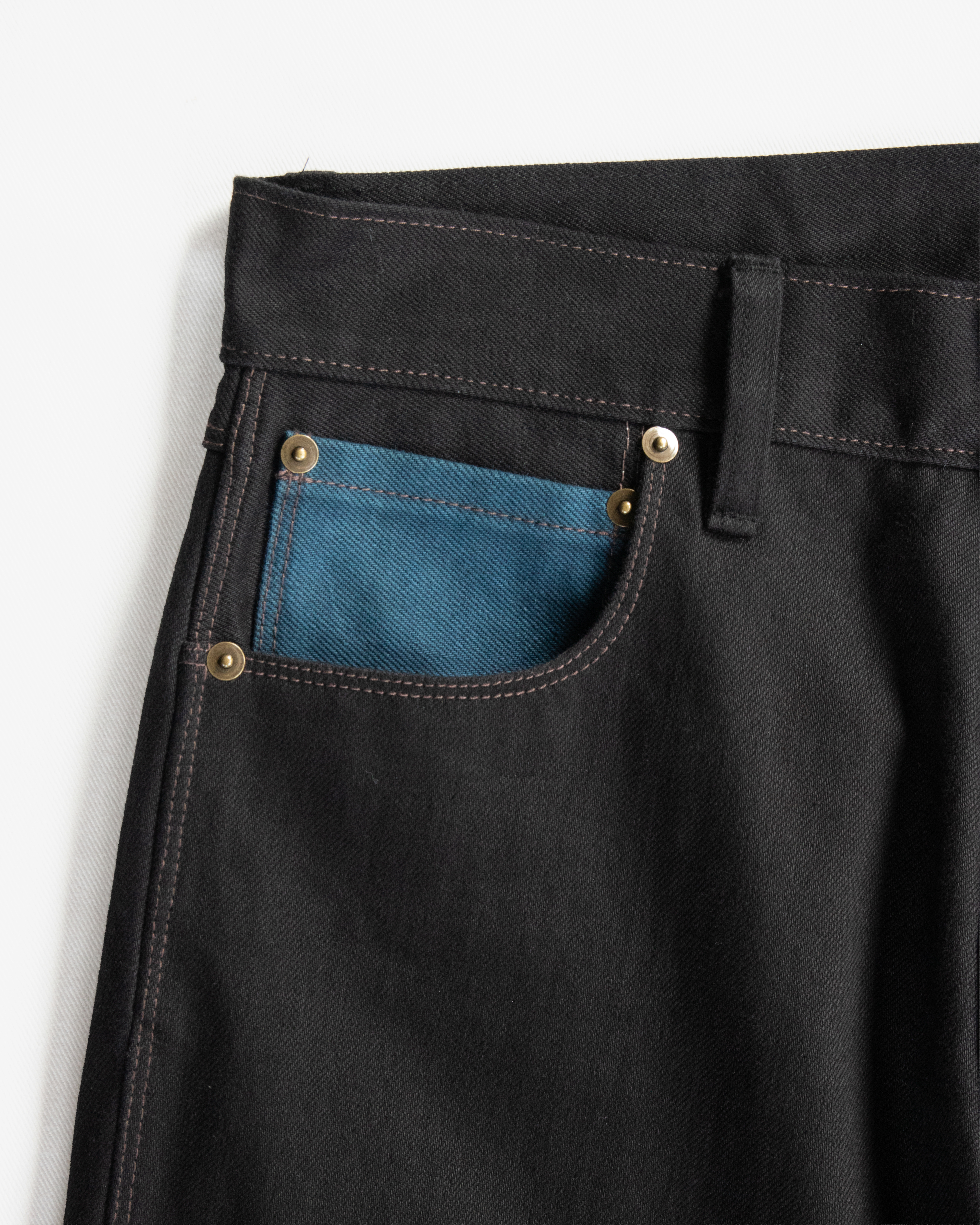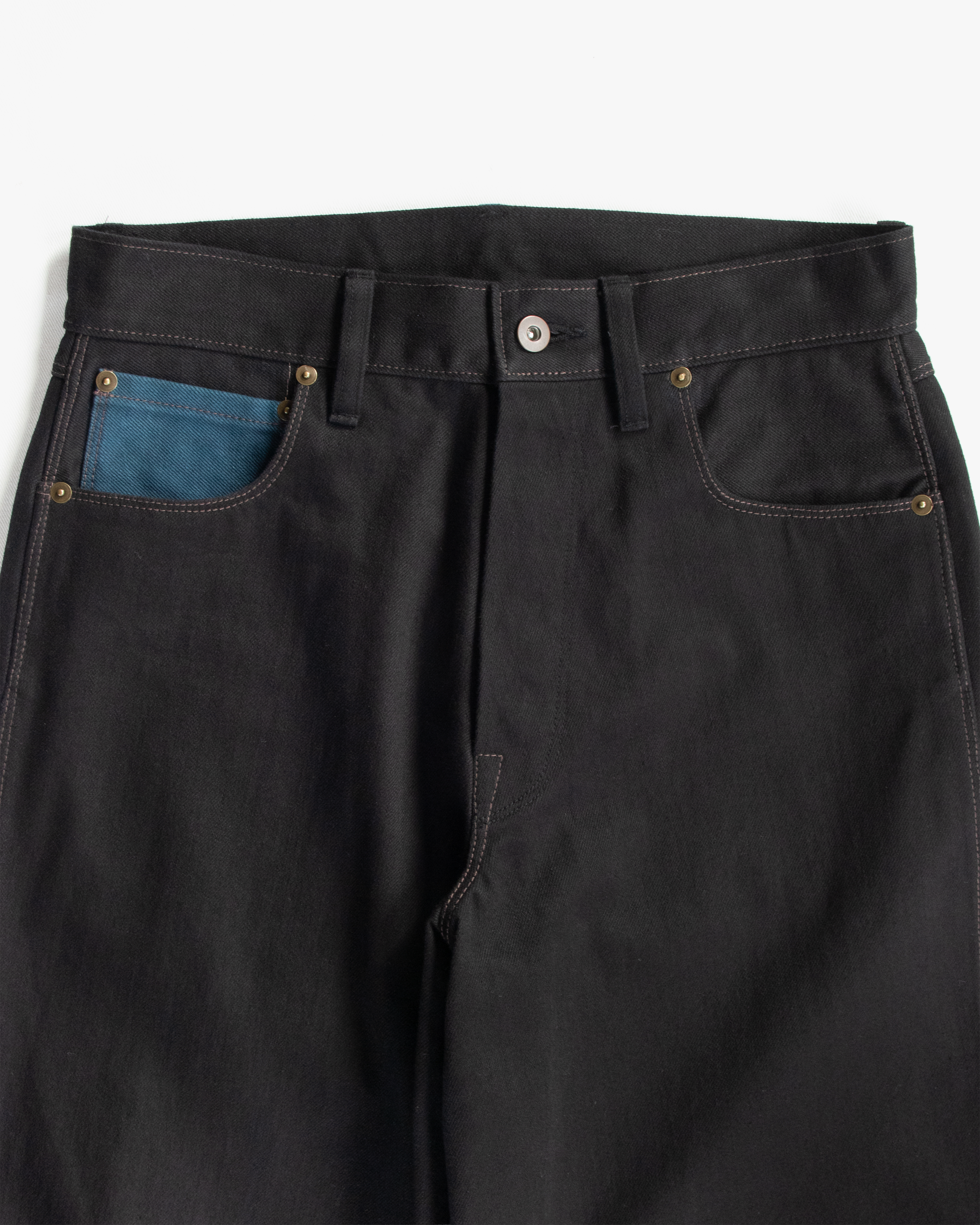 コインポケットと後ろベルトループのみ墨藍を使用しているのでボディの黒との経年変化を楽しんでもらいたいです。