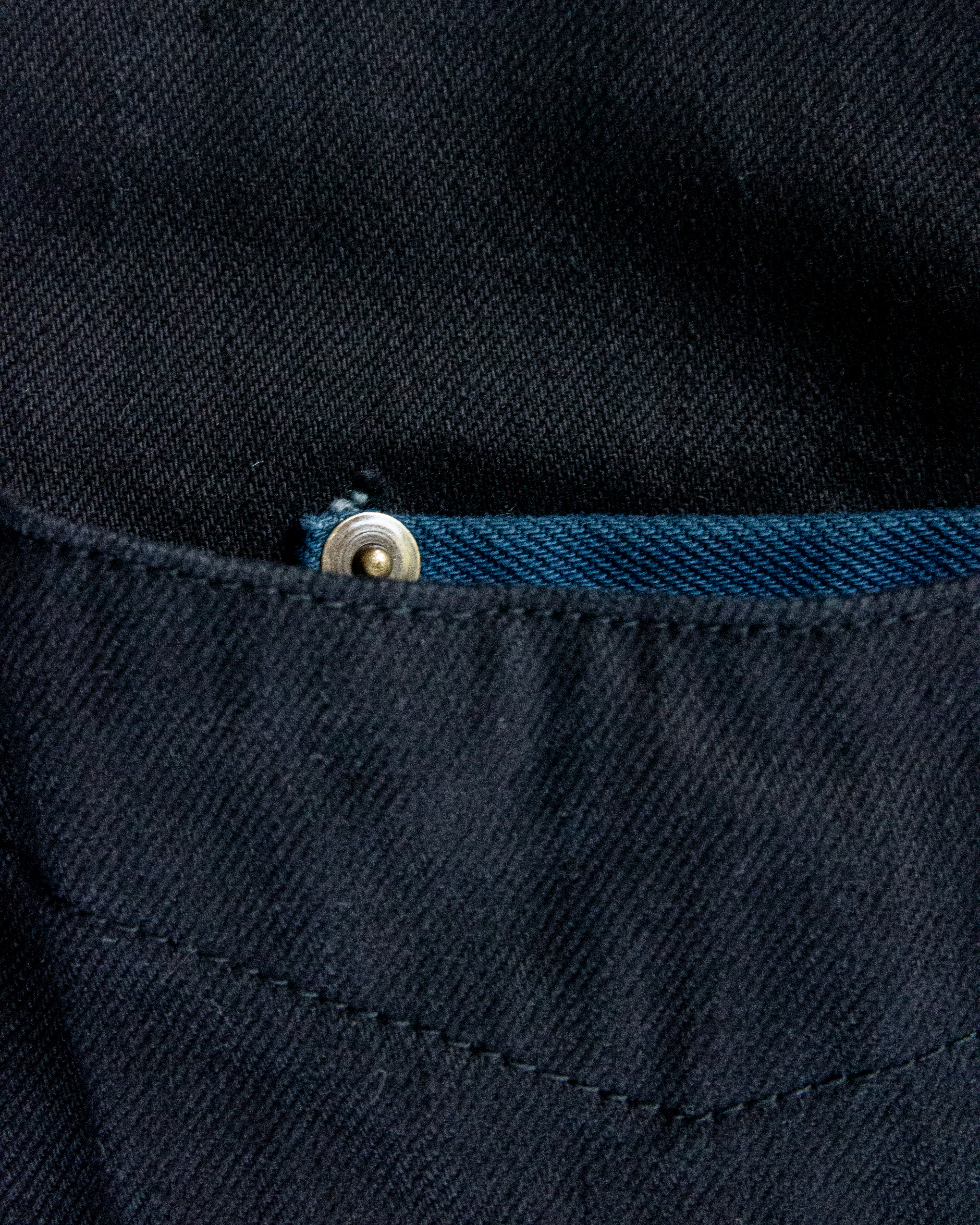 また背面にアクションプリーツを入れる事で着用時のストレスを軽減しています。コインポケットのみ墨藍を使用しているので経年変化の差を楽しんでもらいたいです。